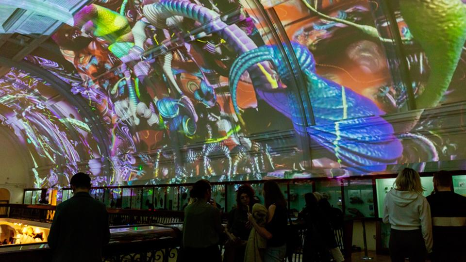 In the Natural History Gallery, visitors were transported into a psychedelic world full of alien forms by Mutator VR, an immersive virtual reality experience developed by pioneering Goldsmiths computer artist Prof William Latham. Latham was inspired by the gallery’s themes of evolution and the VR experience was projected across the entire vaulted Victorian ceiling.