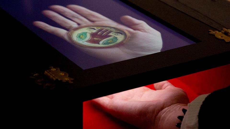 The Horniman Palm Reader, created by Jesse Wolpert, Associate Lecturer in Dr James Bulley, was also located in the World Gallery. It saw participants place their hand into a mysterious digital devise that displayed different objects from the collection on their palms. They could then seek out these artefacts in the museum to discover more.