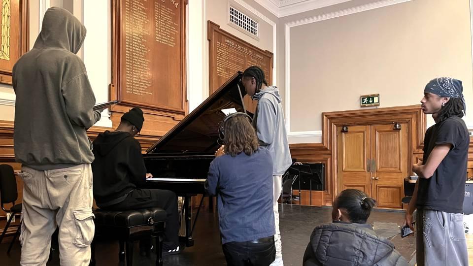 Young people from Alchemy, our award-winning creative arts project for local young people work at the piano in Deptford Town Hall Chamber