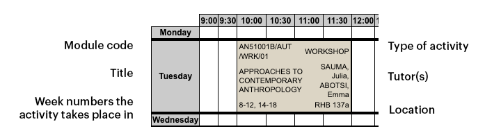 In the above example, '8-12, 14-18' means the activity happens every week except for week 13, which is a reading week.