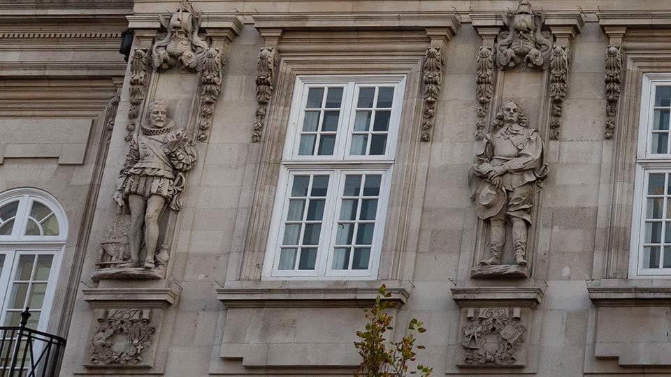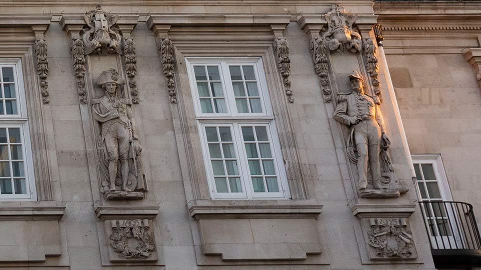 The four statues in the niches at the front of the building (pictured below) represent four naval figures:
